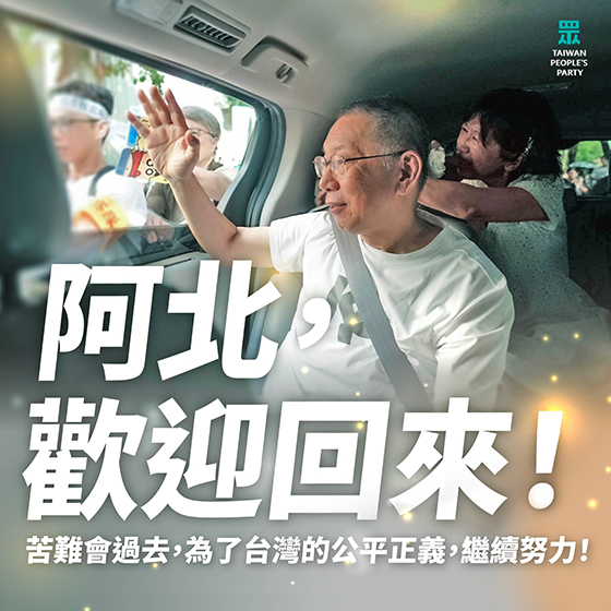 柯P,好久不見,歡迎回來!這一年來、這一路上,謝謝所有支持者,謝謝所有站出來為不公不義發聲的公民,為柯P加油、給他支持與力量。正如柯文哲所說,他個人的苦難會過去,但台灣還有很多事情,需要繼續努力,我們始終相信,一個公平正義的國家,才是人民最重要的福祉。這不只是柯文哲的奮戰,更需要每一位公民為了台灣的未來挺身而出。